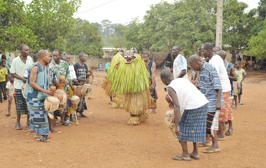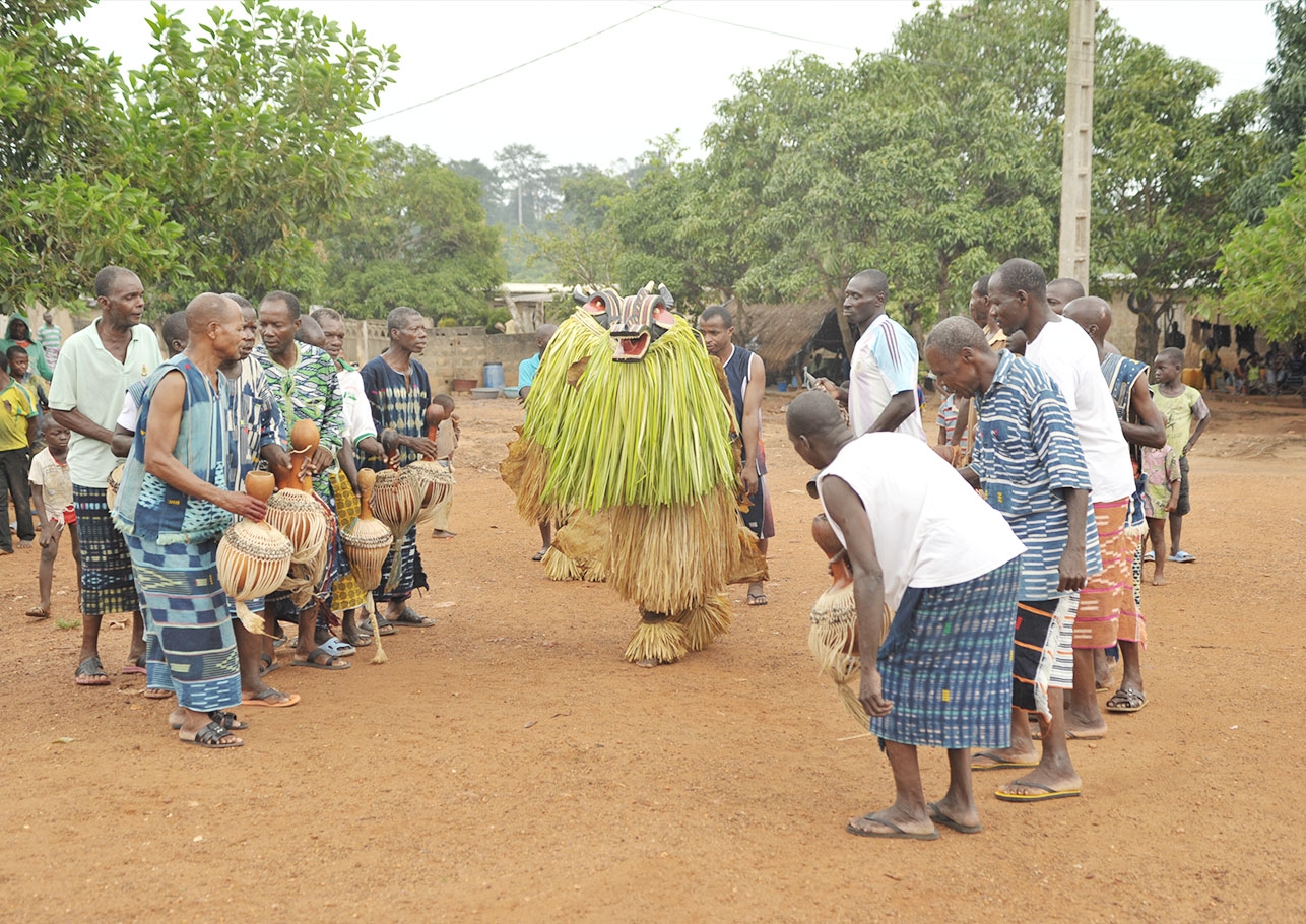 Le Goly est une danse sacrée que les Baoulé ont empruntée à leurs voisins Wan vers 1900. C’est un spectacle de danse de masque qui implique tout le village. Tout le monde prend part à la fête, mais l’élément central du Goly, c’est le masque.